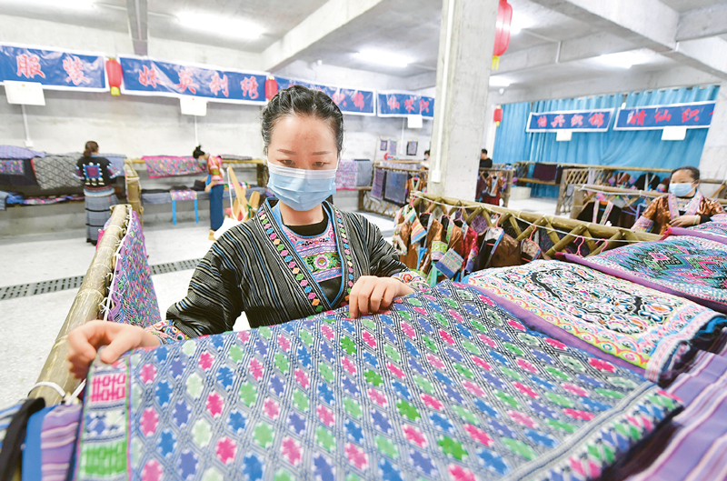 就業(yè)扶貧是最有效最直接的脫貧方式,通過設(shè)立扶貧車間等方式讓貧困群眾實(shí)現(xiàn)就近就地就業(yè),是民營(yíng)企業(yè)參與扶貧開發(fā)事業(yè)的重要方式。圖為2020年4月10日,在廣西柳州市融水苗族自治縣香粉鄉(xiāng)雨卜村“巾幗扶貧車間”中,女工們?cè)谡砜楀\。 新華社記者 黃孝邦/攝