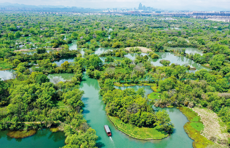 作為世界上不可多得的城中次生濕地,浙江省杭州市西溪濕地生態(tài)資源豐富、自然景觀幽雅、文化積淀深厚。隨著城市化快速推進(jìn),西溪濕地的環(huán)境一度惡化,濕地生態(tài)功能和生物多樣性受到明顯損害,水質(zhì)一度跌至劣Ⅴ類,少數(shù)地方甚至魚蝦絕跡。2003年9月,在浙江省委、省政府的領(lǐng)導(dǎo)下,西溪濕地綜合保護(hù)工程正式啟動(dòng)。經(jīng)過多年持續(xù)治理,西溪濕地核心區(qū)域水質(zhì)達(dá)Ⅱ類水質(zhì)標(biāo)準(zhǔn),已成為國家生態(tài)文明建設(shè)的重要實(shí)踐基地。圖為2020年4月1日,游船行駛在西溪濕地水道上(無人機(jī)照片)。 新華社記者 翁忻旸/攝