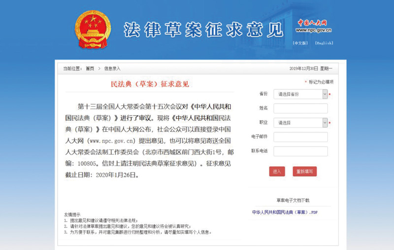 民法典編纂過程中,先后10次通過中國人大網(wǎng)公開征求意見,累計收到42.5萬人提出的102萬條意見建議。圖為民法典(草案)征求意見網(wǎng)頁截圖。