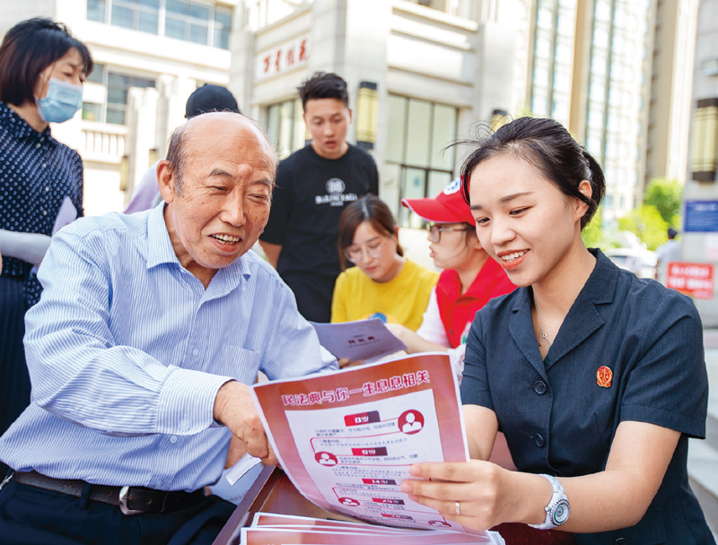 2020年6月6日,江蘇省海安市立發(fā)街道嘉麟社區(qū)聯(lián)合海安市人民法院開展“民法典讓生活更美好”送法進(jìn)社區(qū)活動,法院工作人員和社區(qū)普法志愿者把民法典內(nèi)容簡明易懂地告知居民,提高公民的法律素養(yǎng),用民法典護(hù)航美好生活。 中新社發(fā) 翟慧勇/攝