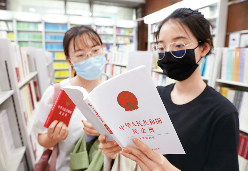 《中華人民共和國民法典》單行本及多個版本在新華書店上架以來,吸引不少讀者駐足選購。圖為2020年6月9日,讀者在北京王府井新華書店翻閱《中華人民共和國民法典》。 中新社發(fā) 陳曉根/攝