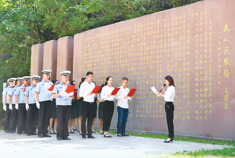 在中國共產(chǎn)黨成立99周年之際,革命圣地延安的黨員干部紛紛來到紅色景區(qū),舉行主題黨課、現(xiàn)場教學(xué)、重溫入黨誓詞等活動(dòng)。 圖為2020年6月29日,在延安市張思德廣場,黨員干部在誦讀《為人民服務(wù)》。 新華社記者 張博文/攝