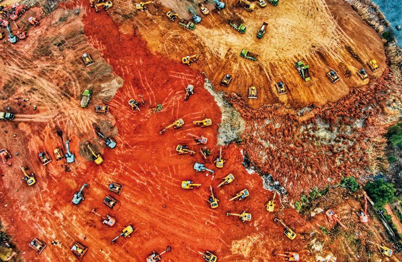 為確保按時(shí)完成建設(shè)任務(wù),火神山醫(yī)院建設(shè)現(xiàn)場(chǎng)機(jī)械設(shè)備火力全開,24小時(shí)不間斷施工。不同于當(dāng)年北京小湯山醫(yī)院建在平原,超過7萬(wàn)平方米的火神山醫(yī)院臨水而建,地面高差最大處近10米,既有建筑物要拆除,還有大片蘆葦蕩要清淤、魚塘要回填,土方開挖、砂石換填量近40萬(wàn)立方米,而這些場(chǎng)地平整任務(wù)必須在兩天之內(nèi)完成。圖為火神山醫(yī)院場(chǎng)地平整施工現(xiàn)場(chǎng)航拍。 中建集團(tuán)供圖