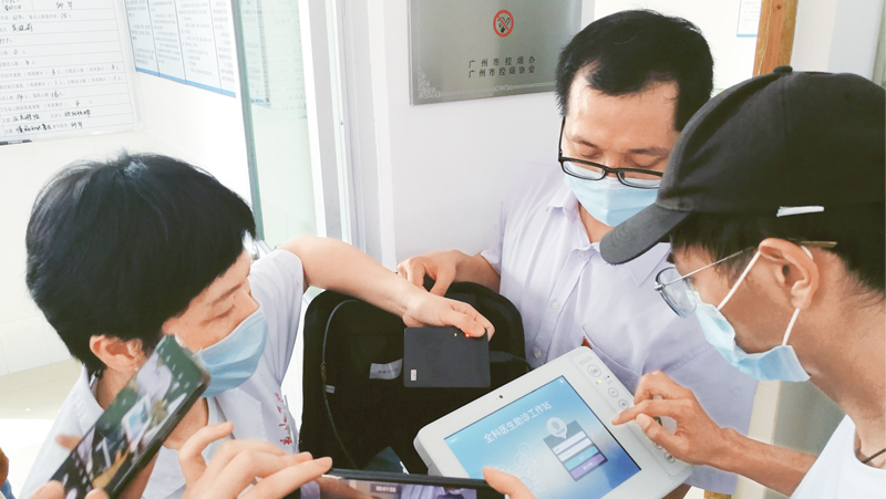 為提升基層醫(yī)療服務(wù)水平,花都區(qū)引入全新信息化管理平臺(tái),2019年9月起試點(diǎn)為區(qū)內(nèi)基層醫(yī)生配備多功能巡診包。巡診包又稱“移動(dòng)工作站”,可進(jìn)行血壓、血糖、心電、尿酸、膽固醇等檢測(cè),具有便攜性強(qiáng)、易操作、數(shù)據(jù)實(shí)時(shí)同步等特點(diǎn),鄉(xiāng)醫(yī)可攜帶為村民開(kāi)展入戶檢查,大大提高了工作效率。圖為儒林村駐村醫(yī)生向記者展示出診時(shí)隨身攜帶的多功能巡診包。 本刊記者 王兆斌/攝