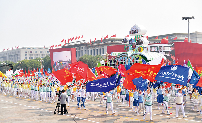 2019年10月1日,在慶祝新中國成立70周年大會群眾游行活動中,“立德樹人”方陣的教師和學生代表們揮舞著鮮花和校旗,伴著歌聲走過長安街。 新華社記者 李尕/攝