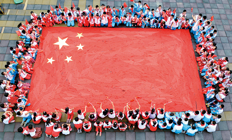 社會主義辦學(xué)方向是我國教育最鮮亮的底色,我國教育要培養(yǎng)的是社會主義建設(shè)者和接班人,這是個根本性的問題。圖為山東省沂源縣荊山路小學(xué)開展“紅領(lǐng)巾拼國旗祝福祖國迎國慶”活動,學(xué)生們在老師帶領(lǐng)下用紅領(lǐng)巾拼出了一面巨型國旗,表達(dá)對偉大祖國的祝福。 教育部供圖