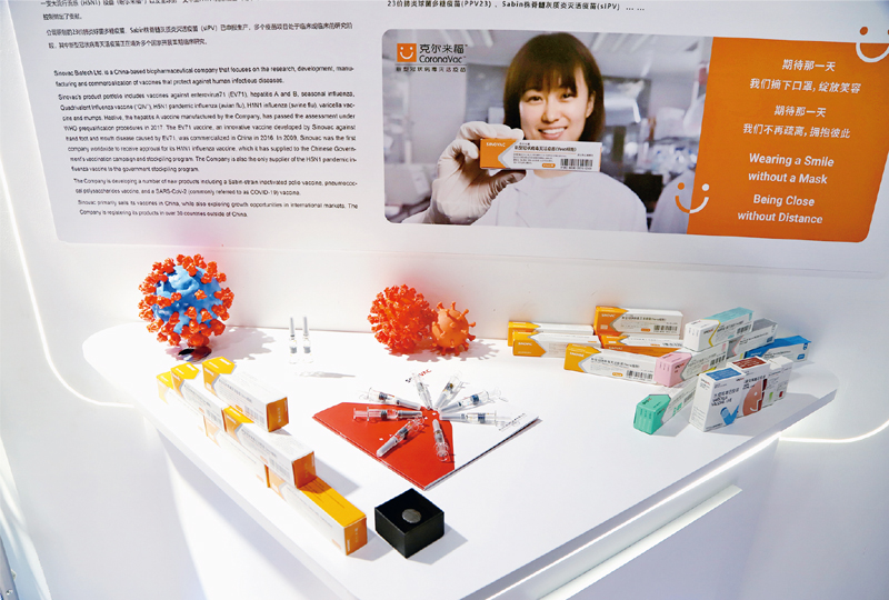 新冠肺炎疫情發(fā)生后,我國(guó)采取多條技術(shù)路線加快研發(fā)疫苗,取得積極進(jìn)展。習(xí)近平總書(shū)記在第七十三屆世界衛(wèi)生大會(huì)視頻會(huì)議開(kāi)幕式上指出:“中國(guó)新冠疫苗研發(fā)完成并投入使用后,將作為全球公共產(chǎn)品,為實(shí)現(xiàn)疫苗在發(fā)展中國(guó)家的可及性和可負(fù)擔(dān)性作出中國(guó)貢獻(xiàn)?!眻D為9月4日,中國(guó)自主研發(fā)的新冠病毒滅活疫苗“克爾來(lái)?!痹?020年中國(guó)國(guó)際服務(wù)貿(mào)易交易會(huì)上亮相,引起廣泛關(guān)注。 中新社發(fā) 郭海鵬/攝