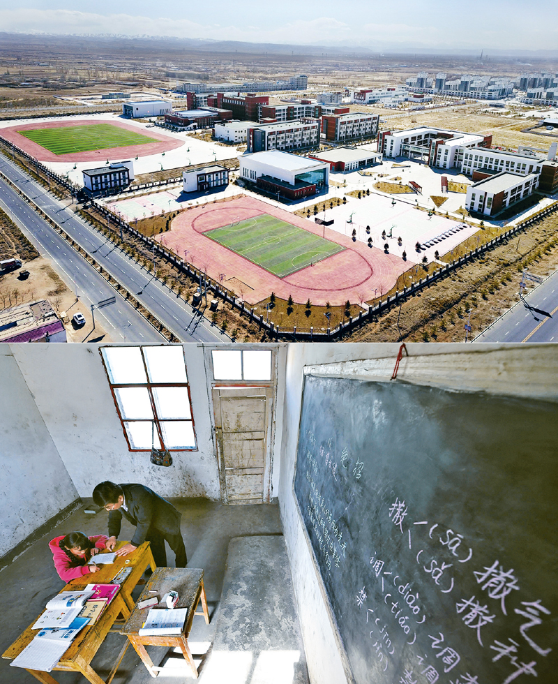 脫貧攻堅(jiān)戰(zhàn)打響以來(lái),甘肅省古浪縣對(duì)南部貧困山區(qū)的3個(gè)鄉(xiāng)和數(shù)十個(gè)行政村實(shí)施易地扶貧搬遷,整鄉(xiāng)整村搬遷至黃花灘生態(tài)移民區(qū),并完善水、電、路、氣、網(wǎng)和學(xué)校、醫(yī)院等公共服務(wù)設(shè)施,大力發(fā)展特色產(chǎn)業(yè),努力使群眾安居樂(lè)業(yè)。上圖為2020年3月10日拍攝的古浪縣黃花灘生態(tài)移民區(qū)綠洲生態(tài)移民小鎮(zhèn)的學(xué)校校園(無(wú)人機(jī)照片);下圖為2016年4月21日拍攝的古浪縣定寧鎮(zhèn)曉光村王家水小學(xué)教室舊貌。 新華社記者 范培珅/攝