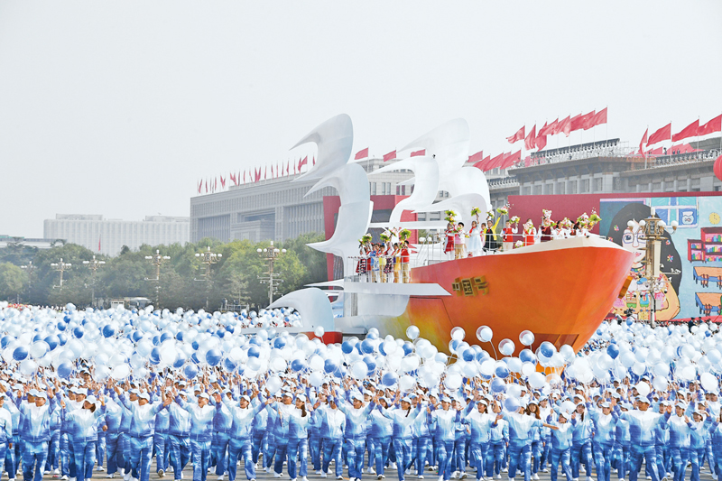 2019年10月1日上午,慶祝中華人民共和國(guó)成立70周年大會(huì)在北京天安門(mén)廣場(chǎng)隆重舉行。這是群眾游行中的“揚(yáng)帆遠(yuǎn)航”方陣。 新華社記者 李欣/攝