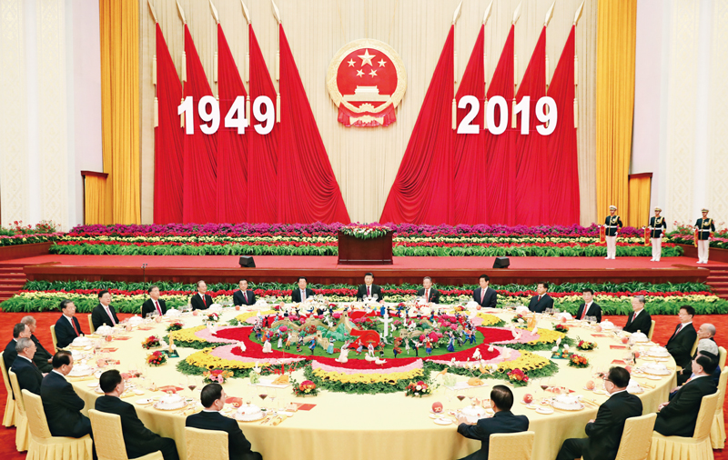 2019年9月30日晚,慶祝中華人民共和國成立70周年招待會在北京人民大會堂隆重舉行。習(xí)近平、李克強(qiáng)、栗戰(zhàn)書、汪洋、王滬寧、趙樂際、韓正、王岐山等黨和國家領(lǐng)導(dǎo)人與4000余名中外人士歡聚一堂,共慶新中國70華誕。 新華社記者 黃敬文/攝
