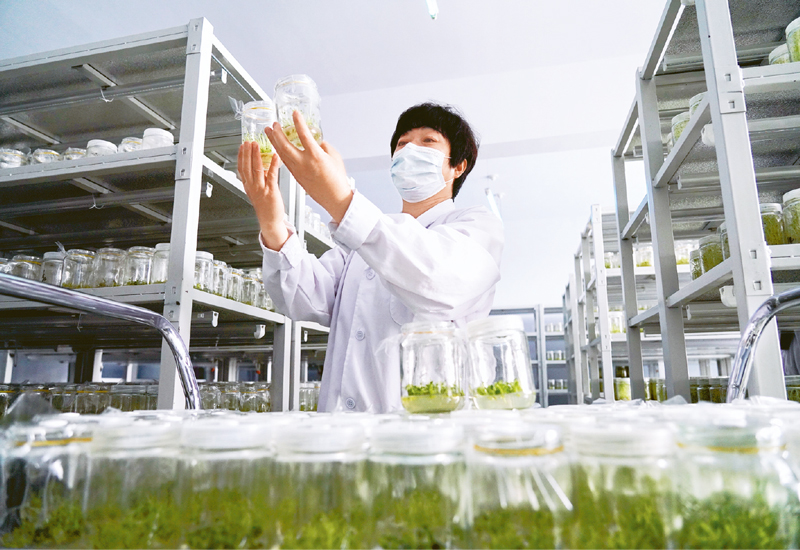 2017年1月24日,農(nóng)歷春節(jié)前夕,中共中央總書記習(xí)近平冒著四九嚴寒、踏著皚皚白雪來到河北省張北縣德勝村,看望慰問困難群眾,與基層干部群眾一起算扶貧賬、謀脫貧計??倳浀牡絹?,猶如浩蕩春風(fēng)吹進了德勝村。全村干部群眾牢記殷殷囑托,以飽滿的激情開展脫貧攻堅戰(zhàn),3年多時間讓村莊褪去舊貌、換了新顏。圖為技術(shù)人員在德勝村無菌育種室內(nèi)察看馬鈴薯瓶苗長勢。攝于2020年5月。 新華社記者 牟宇/攝
