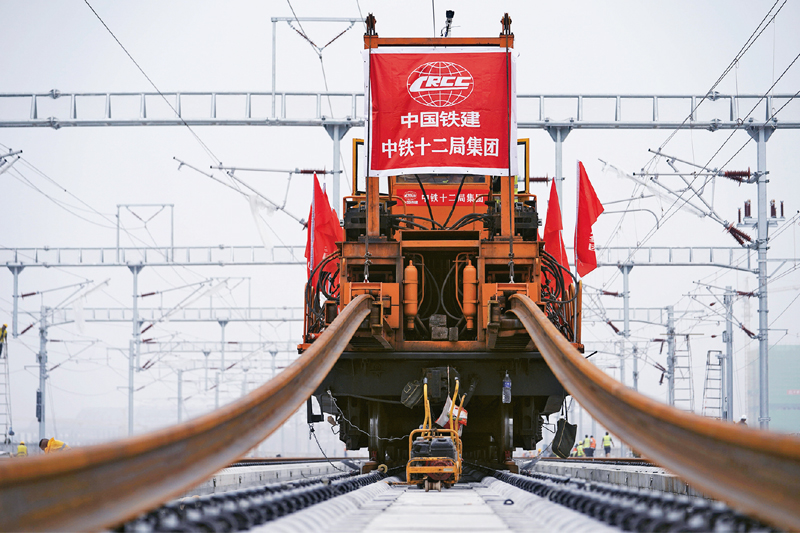 2020年8月17日,京雄城際鐵路全線軌道貫通。圖為工人駕駛鋪軌車安裝最后一段鋼軌。 新華社記者 邢廣利/攝