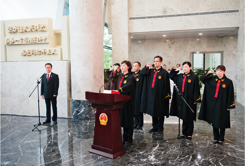 2017年8月18日,全國首家互聯(lián)網(wǎng)法院在杭州成立。該法院定位于用互聯(lián)網(wǎng)方式審理互聯(lián)網(wǎng)案件,當(dāng)事人通過互聯(lián)網(wǎng),足不出戶就能完成訴訟,實現(xiàn)“網(wǎng)上糾紛網(wǎng)上了”。圖為互聯(lián)網(wǎng)法院成立當(dāng)日,法官們參加憲法宣誓儀式。 新華社記者 翁忻旸/攝