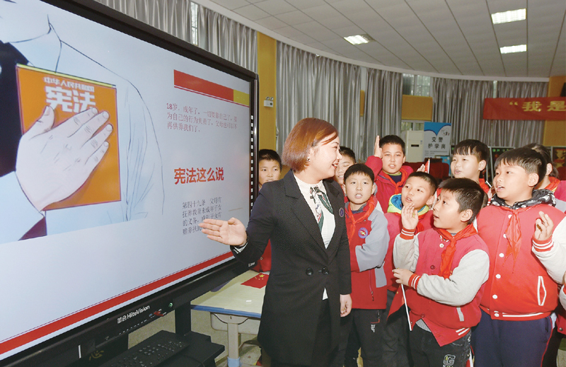 堅持依法治國首先要堅持依憲治國,要全面貫徹實施憲法,必須在全社會深入開展尊崇憲法、學(xué)習(xí)憲法、遵守憲法、維護(hù)憲法、運用憲法宣傳教育活動,弘揚憲法精神,加強(qiáng)憲法實施和監(jiān)督。圖為2018年12月3日,安徽省合肥市經(jīng)開區(qū)明珠居委會法律援助律師在給明珠小學(xué)的學(xué)生們講解憲法知識。 新華社記者 郭晨/攝