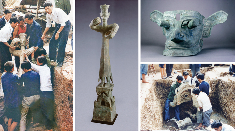 位于四川廣漢的三星堆遺址發(fā)現(xiàn)于1927年,遺址所處年代相當(dāng)于夏代晚期至商周之際。1986年,在遺址祭祀?yún)^(qū)發(fā)掘兩座祭祀坑,出土金杖、面罩、銅神壇、神樹、人像、面具、玉石禮器、象牙雕飾等珍貴文物1720件,揭開了早期古蜀文明的神秘面紗。2020年,三星堆遺址考古新發(fā)現(xiàn)五座商代晚期祭祀坑,對(duì)進(jìn)一步揭示古蜀文明的文化面貌與重要價(jià)值,不斷深化對(duì)多元一體中華文明形成歷史進(jìn)程的認(rèn)識(shí)具有重要意義。圖為1986年三星堆遺址一、二號(hào)祭祀坑發(fā)掘現(xiàn)場,以及出土的銅大立人像和銅縱目面具。 四川省文物考古研究院供圖