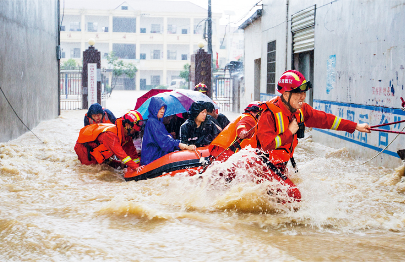 2020年7月8日,江西省九江市都昌縣大港鎮(zhèn)鹽田中學(xué)師生因山洪被困,九江市消防救援支隊(duì)消防員利用橡皮艇轉(zhuǎn)移受困人員。8月31日,中央宣傳部向全社會(huì)發(fā)布了江西省九江市消防救援支隊(duì)的先進(jìn)事跡,授予他們“時(shí)代楷模”稱號(hào)。 新華社發(fā) 傅建斌/攝