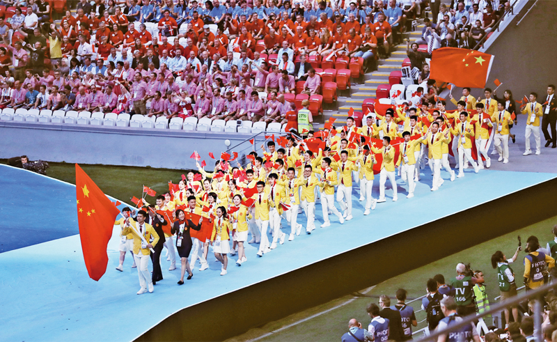 2019年8月,第45屆世界技能大賽在俄羅斯喀山舉行,中國代表團(tuán)派出63人參加了全部項(xiàng)目的比賽,共獲得16枚金牌、14枚銀牌、5枚銅牌和17個(gè)優(yōu)勝獎(jiǎng),榮登金牌榜、獎(jiǎng)牌榜、團(tuán)體總分第一,向世界展示了中國工人的高技能、高素質(zhì)。習(xí)近平總書記對選手們?nèi)〉眉芽冏鞒鲋匾甘荆瑥?qiáng)調(diào)要在全社會(huì)弘揚(yáng)精益求精的工匠精神,激勵(lì)廣大青年走技能成才、技能報(bào)國之路。圖為中國代表團(tuán)在大賽開幕式上出場。 新華社記者 魯金博/攝