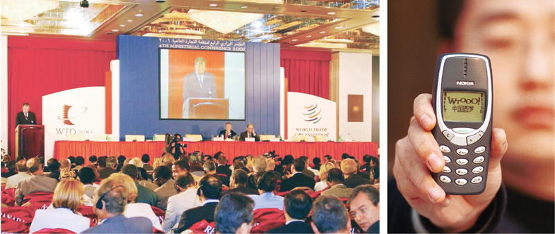 2001年11月10日,在卡塔爾首都多哈,世界貿(mào)易組織第四屆部長級會議全體協(xié)商一致,審議并通過了中國加入世貿(mào)組織的決定。左圖為大會現(xiàn)場(新華社記者 王建華/攝);右圖為當時受到眾多用戶歡迎的手機短信圖片(新華社記者 侯俊/攝)。