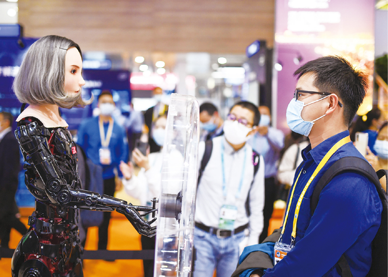 中國國際進口博覽會,是世界上第一個以進口為主題的國家級展會,是中國主動向世界開放市場的重大舉措。2020年11月5—10日,第三屆進博會在上海成功舉行。圖為11月6日,在技術(shù)裝備展區(qū),一名觀眾與EX仿生機器人對視。 新華社記者 李任滋/攝