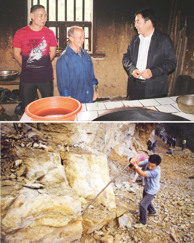 上圖為2016年4月,黃詩燕(右一)在炎陵縣大坑村開展精準扶貧工作調(diào)研(湖南省委宣傳部供圖);下圖為1999年9月,毛相林用鋼釬撬大石,帶領(lǐng)村民一寸寸鑿開出山公路(重慶市委宣傳部供圖)。