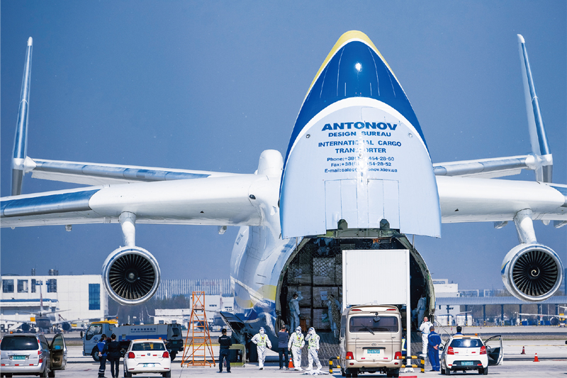 疫情以來,中國(guó)發(fā)起了新中國(guó)成立以來規(guī)模最大的全球人道主義行動(dòng),向多國(guó)提供了口罩2000多億只、防護(hù)服20億件、檢測(cè)試劑盒8億份,承擔(dān)起全球抗疫物資最大供應(yīng)國(guó)的責(zé)任,有力支持全球疫情防控。圖為2020年4月13日,全球最大運(yùn)輸機(jī)AN225在天津?yàn)I海國(guó)際機(jī)場(chǎng)裝載國(guó)際防疫物資。 中新社記者 佟郁/攝