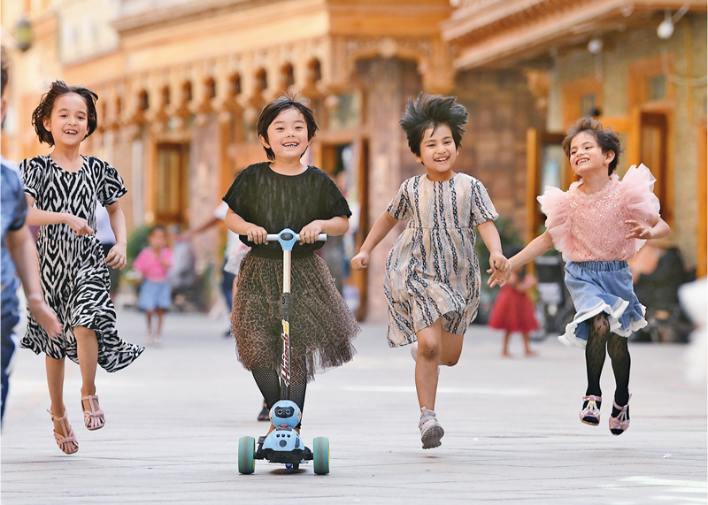 歷經(jīng)4年改造,新疆和田市團(tuán)城的鴿子巷由曾經(jīng)臟亂差的棚戶區(qū)變身為古城新名片。圖為孩子們?cè)邙澴酉锿嫠#?020年5月27日攝)。 新華社記者 沙達(dá)提/攝