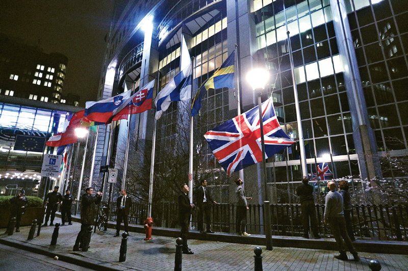 2020年1月31日,在比利時(shí)布魯塞爾的歐洲議會(huì)外,工作人員降下英國(guó)國(guó)旗。布魯塞爾當(dāng)?shù)貢r(shí)間1月31日24時(shí)(英國(guó)時(shí)間1月31日23時(shí)),英國(guó)正式脫離歐盟。 新華社記者 鄭煥松/攝