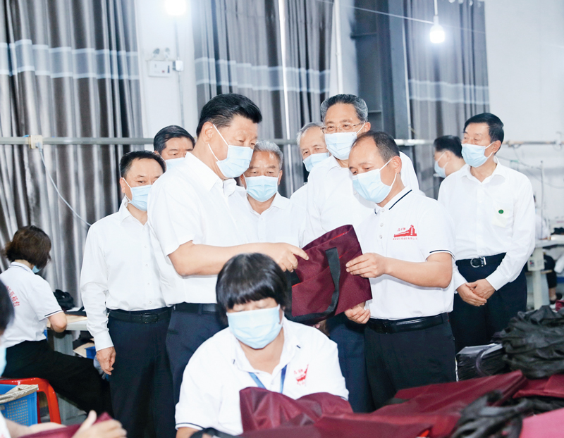 2020年8月18日至21日,中共中央總書(shū)記、國(guó)家主席、中央軍委主席習(xí)近平在安徽省考察。這是18日下午,習(xí)近平在阜陽(yáng)市阜南縣紅亮箱包有限公司察看車間生產(chǎn)線,了解企業(yè)災(zāi)后恢復(fù)生產(chǎn)和受災(zāi)群眾、貧困群眾就業(yè)情況。 新華社記者 鞠鵬/攝