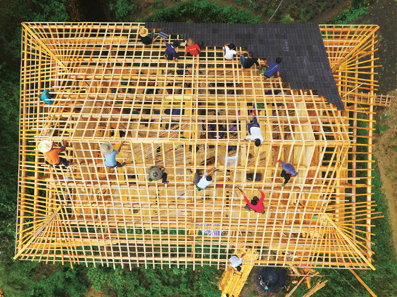 全面小康大家一起走。廣東廉江市和廣西融水苗族自治縣自2017年9月結(jié)成對(duì)子,開(kāi)展“攜手奔小康”幫扶工作,針對(duì)山區(qū)群眾建房材料運(yùn)輸成本高等實(shí)際困難,加大對(duì)貧困群眾危舊房改造的補(bǔ)助力度,幫助他們實(shí)現(xiàn)安居夢(mèng)。圖為2019年9月3日,在黔桂烏英苗寨,群眾正在幫助貧困戶修建新木樓。 新華社記者 黃孝邦/攝