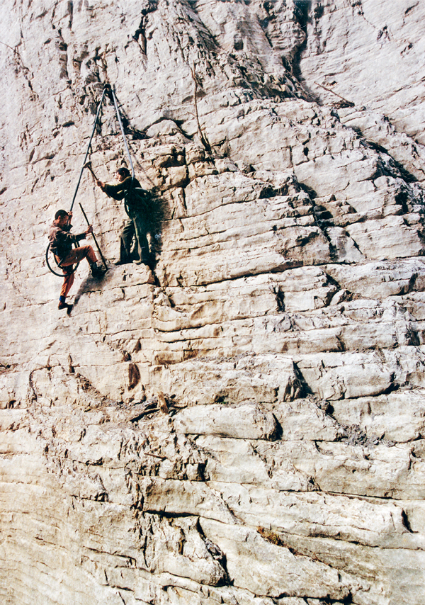 然而,在絕壁上開出一條天路,遠(yuǎn)比想象的更加艱難。沒有工具,毛相林和村民們就腰系長繩,用大錘、鋼釬、簸箕等簡單的農(nóng)具懸在空中鉆炮眼;沒有任何保護(hù)措施,他們在“炸了一炮”的垂直山體上,將炸開的缺口作為“立足之地”,用手挖,用腳蹬;高山絕壁沒有人家,他們就住山頂、喝泉水、睡山洞。為早日修通絕壁路,毛相林最長一次在工地駐扎了3個(gè)月沒回家。他說,我是修路發(fā)起人,最重的活、最危險(xiǎn)的活必須帶頭。就像螞蟻啃骨頭一樣,毛相林帶領(lǐng)著下莊村人,在懸崖上艱難地一寸一寸向前推進(jìn)。