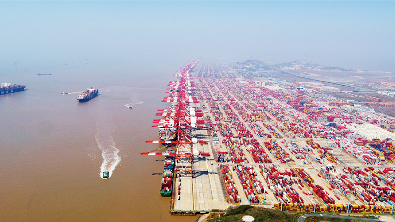 在“綠水青山就是金山銀山”理念指引下,長江經(jīng)濟帶各地進一步加強環(huán)境保護、完善基礎(chǔ)設(shè)施、推進協(xié)調(diào)發(fā)展、擴大對外開放,共同奏響高質(zhì)量發(fā)展新樂章。圖為2020年3月18日上海洋山港集裝箱碼頭。 新華社記者 丁汀/攝