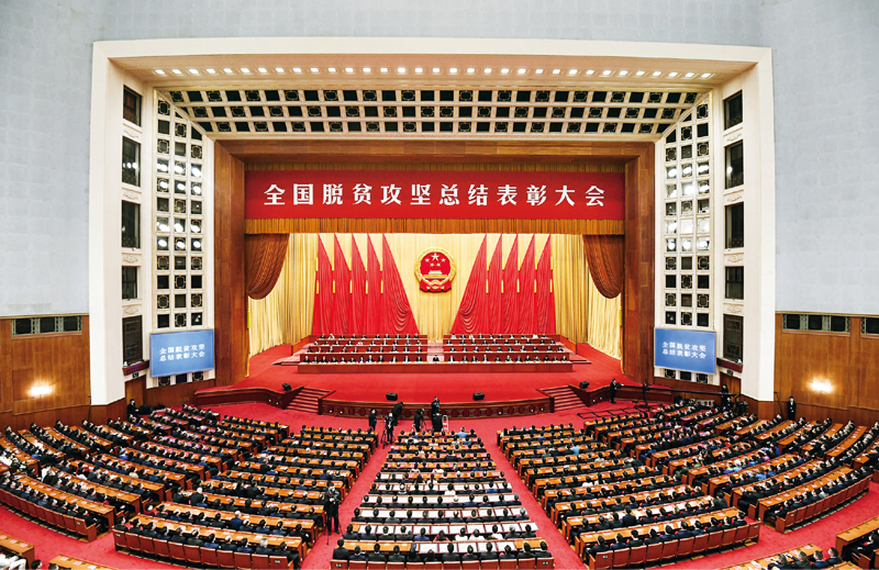 2021年2月25日,全國(guó)脫貧攻堅(jiān)總結(jié)表彰大會(huì)在北京人民大會(huì)堂隆重舉行。圖為大會(huì)現(xiàn)場(chǎng)。 新華社記者 殷博古/攝