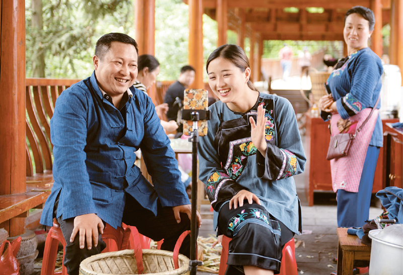 圖為2020年5月15日,湖南省十八洞村第三任駐村扶貧工作隊(duì)隊(duì)長(zhǎng)麻輝煌(左)與返鄉(xiāng)大學(xué)生施林嬌一起通過(guò)網(wǎng)絡(luò)直播推銷土特產(chǎn)。 新華社發(fā) 陳思汗/攝