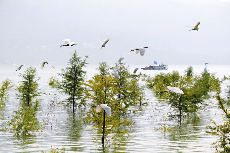 人民法院認(rèn)真貫徹落實(shí)習(xí)近平生態(tài)文明思想,努力為生態(tài)文明建設(shè)與綠色發(fā)展提供優(yōu)質(zhì)司法服務(wù)。在長江三峽庫區(qū),為解決庫區(qū)消落帶植物存活的治理難題,重慶法院引進(jìn)了耐淹耐旱的中山杉。圖為重慶法院長江三峽庫區(qū)生態(tài)修復(fù)司法保護(hù)示范林的中山杉在水庫蓄水時被部分淹沒的景象。 最高人民法院供圖