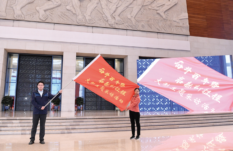 2021年1月18日,中宣部在國家博物館舉行“奮斗百年路 啟航新征程”大型主題采訪活動啟動儀式。中央和地方主要媒體的編輯記者代表在北京主會場和各省區(qū)市分會場參加啟動儀式。圖為記者代表展示“奮斗百年路 啟航新征程”大型主題采訪活動旗幟。 新華社記者 申宏/攝