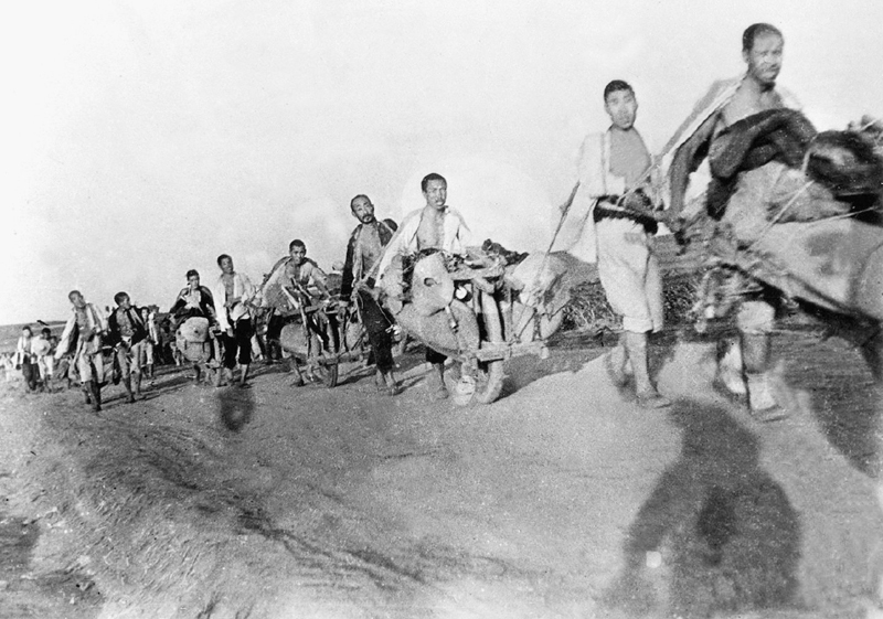 淮海戰(zhàn)役中,廣大群眾用肩挑、車推、驢馱、船運等辦法,將大量糧食、彈藥等軍需物資源源不斷地運往前線。這是山東解放區(qū)的民工支前小車隊。 新華社發(fā)(資料照片)