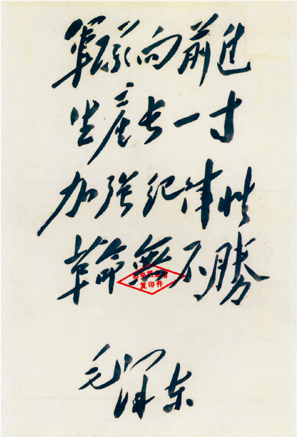 毛澤東在電報中指出,再有一年左右時間即可從根本上打倒國民黨。但毛澤東同時又告誡:“要全部解決國民黨并占領全國,則尚須要更多的時間。我黨我軍仍須穩(wěn)步前進,不驕不躁,以求全勝。我們的口號是:‘軍隊向前進,生產(chǎn)長一寸,加強紀律性,革命無不勝?!?/p>