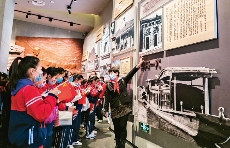 2021年3月25日,內(nèi)蒙古呼和浩特市玉泉區(qū)南茶坊小學(xué)學(xué)生在老師帶領(lǐng)下走進(jìn)內(nèi)蒙古博物院“內(nèi)蒙古革命史陳列”展廳,感受革命情懷,接受“紅色文化”教育。 人民視覺(jué) 丁根厚/攝