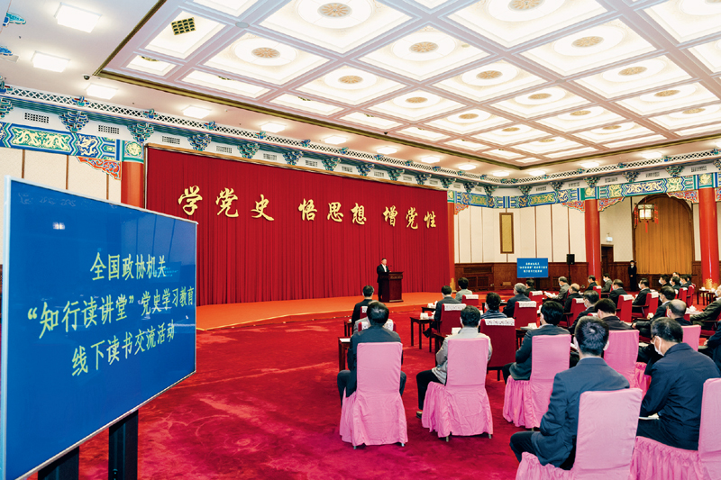 全國政協(xié)機關(guān)注重把開展黨史學(xué)習(xí)教育與政協(xié)讀書活動有機融合,依托委員移動履職平臺網(wǎng)上“全國政協(xié)書院”開展讀書交流活動,建立了“中共黨史學(xué)習(xí)”等12個主題讀書群,形成了線上線下相結(jié)合、讀書履職相促進的讀書學(xué)史格局,推動黨史學(xué)習(xí)教育走深走實、入腦入心。圖為2021年4月20日,全國政協(xié)機關(guān)在北京舉辦以“學(xué)黨史、悟思想、增黨性”為主題的黨史學(xué)習(xí)教育線下讀書交流活動。 全國政協(xié)辦公廳新聞局 王達/攝
