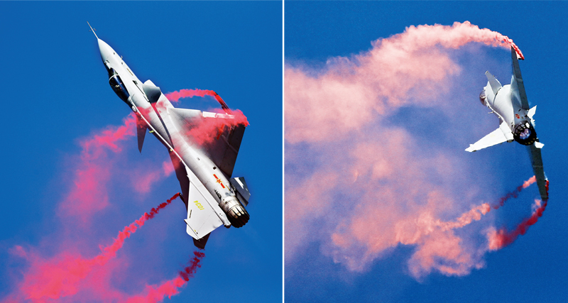 航空發(fā)動機推力矢量技術(shù),是提高飛機機動性進而提升空戰(zhàn)能力的核心技術(shù)之一。2018年11月6日,我國自主研制的殲10B推力矢量驗證機在第十二屆中國國際航空航天博覽會上成功進行了過失速機動飛行表演,展示了“榔頭”機動、“赫伯斯特”機動、“眼鏡蛇”機動、“直升機”機動等典型過失速機動飛行動作,凸顯優(yōu)異的飛行性能,表明我國已成為世界上少數(shù)幾個掌握此項關(guān)鍵技術(shù)的國家之一,是我國航空核心技術(shù)自主創(chuàng)新的又一次成功實踐。圖為殲10B推力矢量驗證機在飛行表演中展示過失速機動飛行動作。 成都飛機工業(yè)(集團)有限責(zé)任公司 周閩/攝