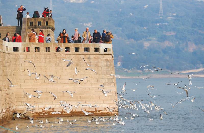 近年來,四川省瀘州市著力打造生態(tài)城市,實(shí)施長江生態(tài)環(huán)境綜合治理工程,飛抵瀘州越冬的紅嘴鷗逐年增多。圖為2020年11月13日,市民在瀘州東門口長江邊觀賞紅嘴鷗。 新華社發(fā) 牟科/攝