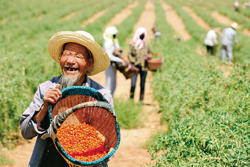 閩寧兩省區(qū)成功實現(xiàn)了援助式扶貧向開發(fā)式扶貧轉(zhuǎn)變。福建的人才、資金、技術(shù)、市場等要素與寧夏貧困地區(qū)的土地、特色農(nóng)產(chǎn)品和勞動力資源有機結(jié)合,帶動了當?shù)噩F(xiàn)代農(nóng)業(yè)和特色優(yōu)勢產(chǎn)業(yè)的發(fā)展。一個個特色優(yōu)勢產(chǎn)業(yè)集群正在改變著西海固落后的生產(chǎn)結(jié)構(gòu)和傳統(tǒng)的生活方式。圖為2018年9月19日,同心縣農(nóng)民種植的枸杞喜獲豐收。 寧夏區(qū)委宣傳部供圖 李君杰/攝