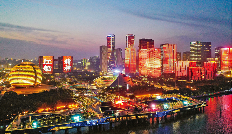 2021年6月24日晚,浙江杭州錢塘江畔上演慶祝建黨100周年主題燈光秀。 人民視覺 董旭明/攝