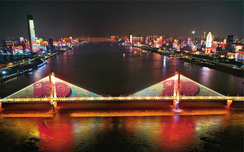 2021年6月24日晚,以“百年征程 波瀾壯闊 百年初心 歷久彌堅”為主題的長江燈光秀點亮湖北武漢。 人民視覺 周國強/攝