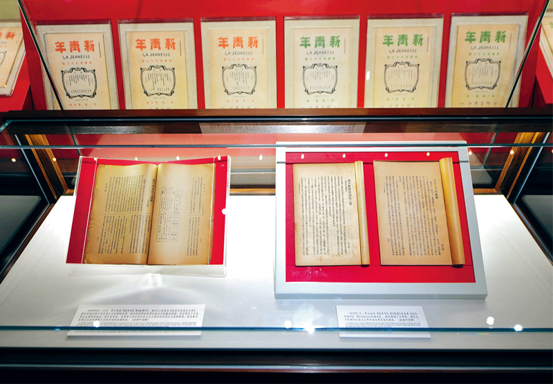 中國共產(chǎn)黨為什么能,中國特色社會主義為什么好,歸根到底是因為馬克思主義行。圖為2021年6月26日在北大紅樓拍攝的刊登李大釗《布爾什維主義的勝利》、《我的馬克思主義觀》的《新青年》5卷5號(右)、6卷5號(左)原件?!⌒氯A社記者 謝晗/攝