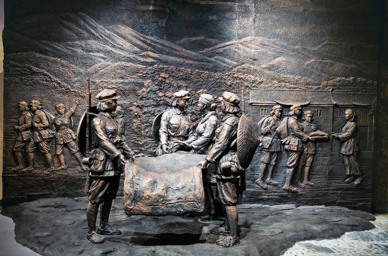 “半條被子”的故事充分體現(xiàn)了中國共產(chǎn)黨的人民情懷和為民本質(zhì)。圖為在湖南省郴州市汝城縣沙洲瑤族村“半條被子的溫暖”專題陳列館拍攝的“半條被子”故事雕塑?!⌒氯A社記者 陳思汗/攝