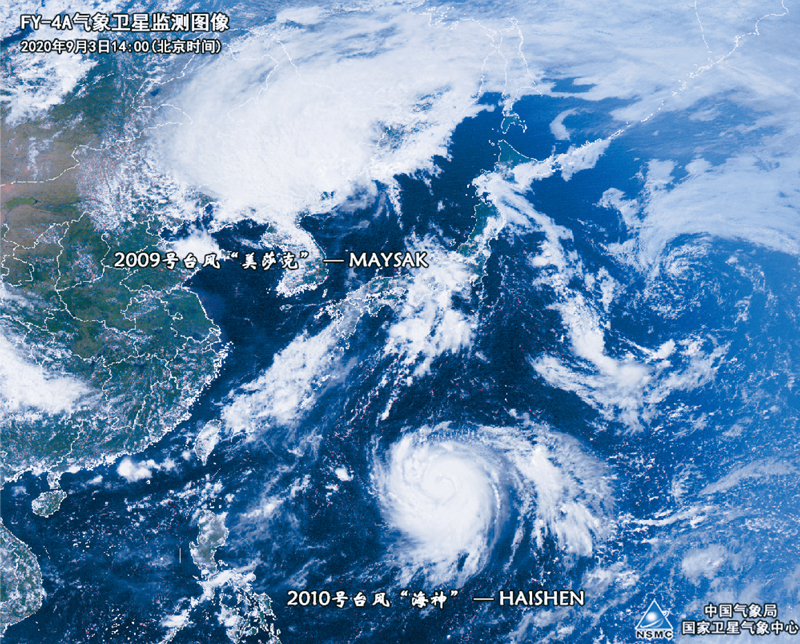 圖為2020年9月3日,風(fēng)云四號A星監(jiān)測到的臺風(fēng)“美莎克”和“海神”“雙臺共舞”。風(fēng)云四號A星于2016年12月11日發(fā)射升空,是我國首顆靜止軌道上三軸穩(wěn)定的定量遙感衛(wèi)星,實(shí)現(xiàn)了我國靜止軌道氣象衛(wèi)星的升級換代。其搭載的靜止軌道輻射成像儀、干涉式大氣垂直探測儀、閃電成像儀、空間天氣監(jiān)測儀器包可獲取高時空分辨率成像資料、大氣三維溫濕度探測資料、閃電監(jiān)測資料和空間天氣監(jiān)測資料,在我國天氣預(yù)報(bào)、氣象防災(zāi)減災(zāi)、應(yīng)對氣候變化、氣候資源開發(fā)、生態(tài)環(huán)境監(jiān)測和空間天氣監(jiān)測預(yù)警等領(lǐng)域得到廣泛應(yīng)用?!≈袊鴼庀缶止﹫D