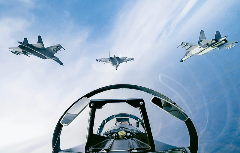 搏擊長空心向黨。圖為北部戰(zhàn)區(qū)空軍航空兵某旅飛行員在訓(xùn)練中組成四機(jī)編隊(duì),撲向地面目標(biāo)展開進(jìn)攻作戰(zhàn)。 新華社發(fā) 楊盼/攝