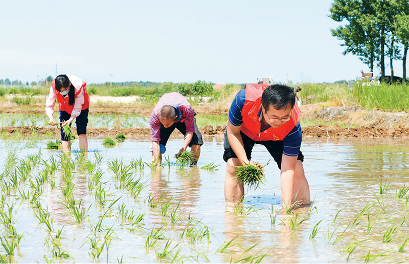 山東省煙臺(tái)市海陽(yáng)市把黨史學(xué)習(xí)教育與群眾所需所盼相結(jié)合,將“我為群眾辦實(shí)事”實(shí)踐活動(dòng)落實(shí)到田間地頭。圖為2021年6月21日,龍山街道的黨員、干部在西沽頭村稻田里幫農(nóng)戶(hù)插秧?!∩綎|省委組織部供圖 李乃杰、徐藝/攝