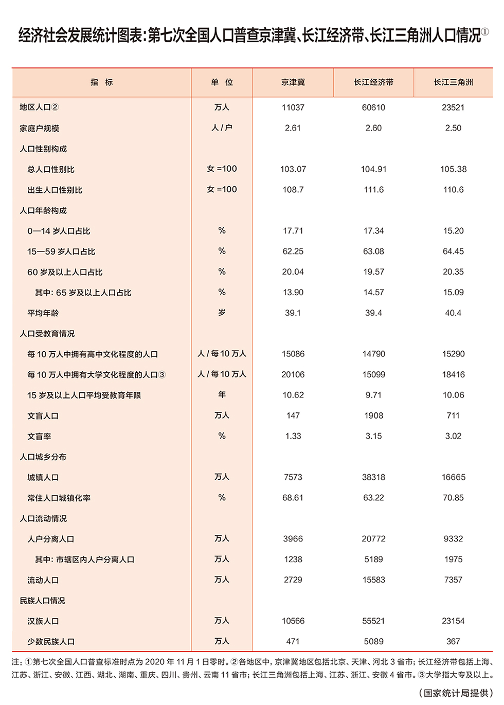 經(jīng)濟社會發(fā)展統(tǒng)計圖表:第七次全國人口普查京津冀、長江經(jīng)濟帶、長江三角洲人口情況
